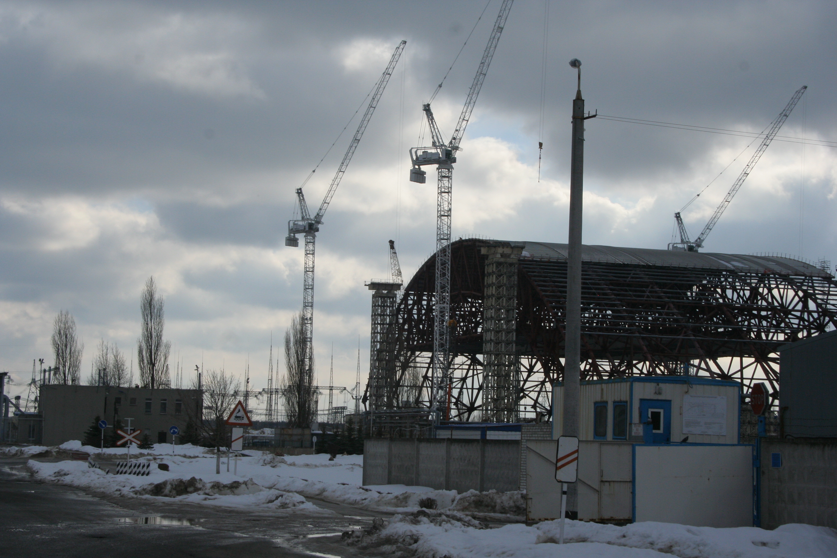 It is as they left it, 27 years ago, in the middle of construction. The entire facility, including the cranes used for construction, is irradiated. Dismantling it and selling it for scrap was not an option, and the cranes themselves are forever useless. Thus, they simply left it all in place, until one day time and the elements tears the whole thing down. Here are the half-constructed cooling towers.